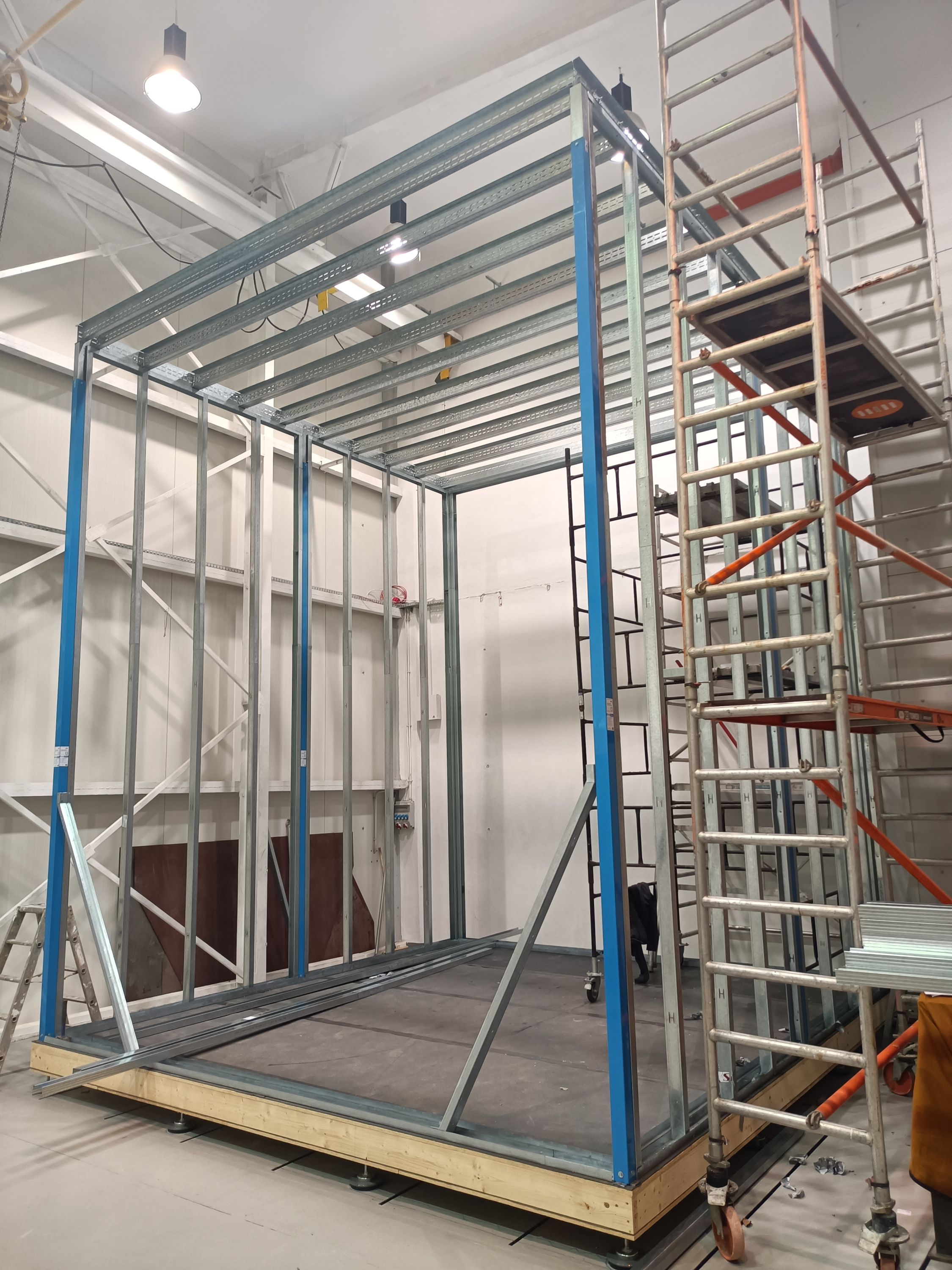 Samonośna konstrukcja w systemie suchej zabudowy posadowiona na wibroizolatorach. Pomieszczenie o podwyższonych standardach izolacyjności akustycznej wg wytycznych Inwestora